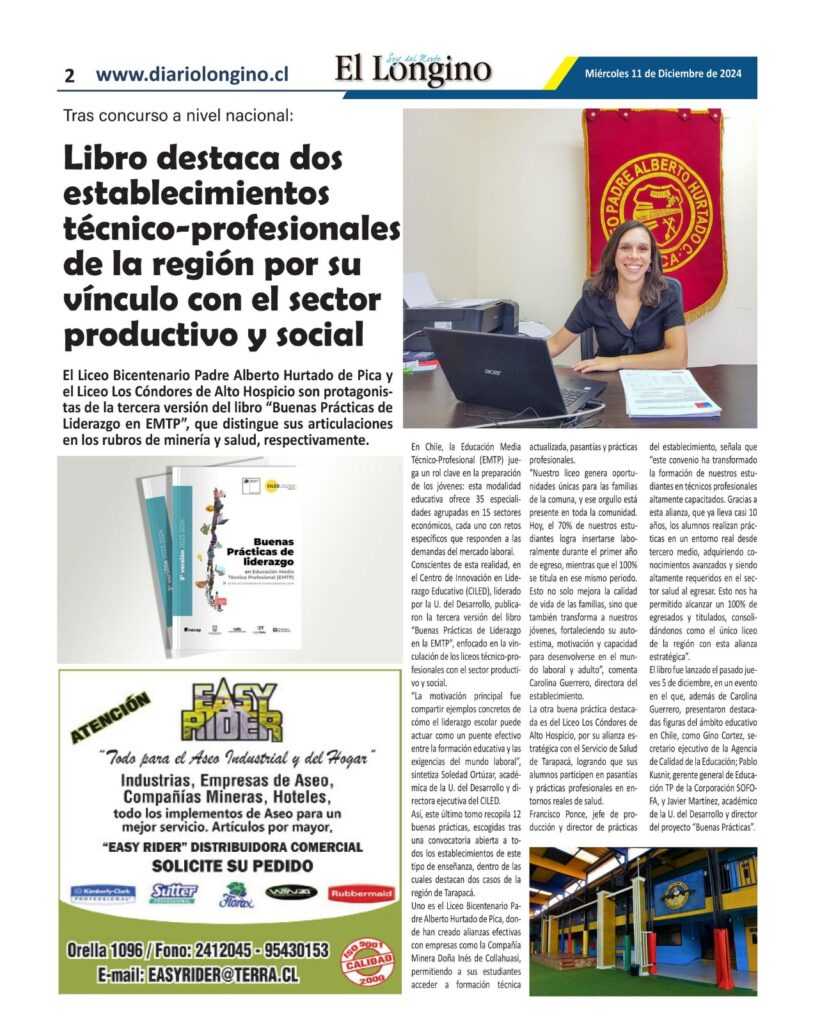 El Liceo Bicentenario Padre Alberto Hurtado de Pica y el Liceo Los Cóndores de Alto Hospicio son protagonistas de la tercera versión del libro “Buenas Prácticas de Liderazgo en EMTP”, que distingue sus articulaciones en los rubros de minería y salud, respectivamente.